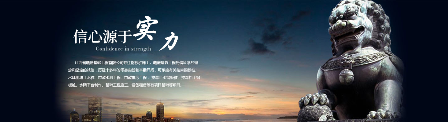 江西省贛盛基礎(chǔ)工程有限公司鋼板樁施工。贛 盛建筑工程憑借科學(xué)的理念和堅定的誠信,歷經(jīng)十多年的傾身實踐和辛勤開拓,可承接有關(guān)拉森鋼板樁、水陸圍堰止水樁、市政水利工程、市政排污工程 、拉森止水鋼板樁、拉森擋土鋼板樁、水陸平臺制作、基礎(chǔ)工程施工、設(shè)備租賃等有項目基礎(chǔ)等項目。 ...